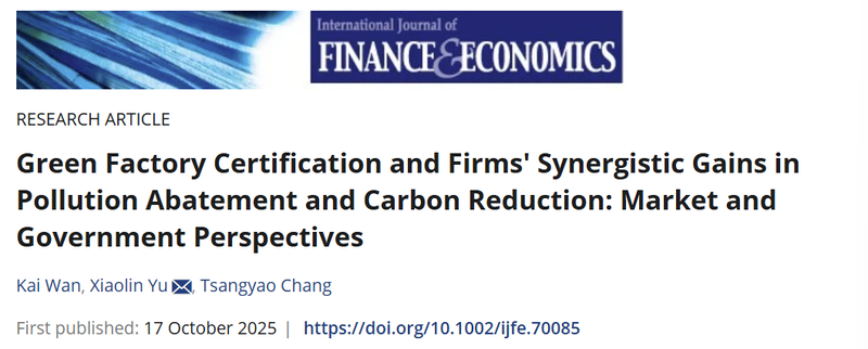 Wan, K., Yu, X., & Chang Tsangyao (2025). Green Factory Certification and Firms’ Synergistic Gains in Pollution Abatement and Carbon Reduction: Market and Government Perspectives. International Journal of Finance & Economics, 30(4). https://doi.org/10.1002/ijfe.70085.