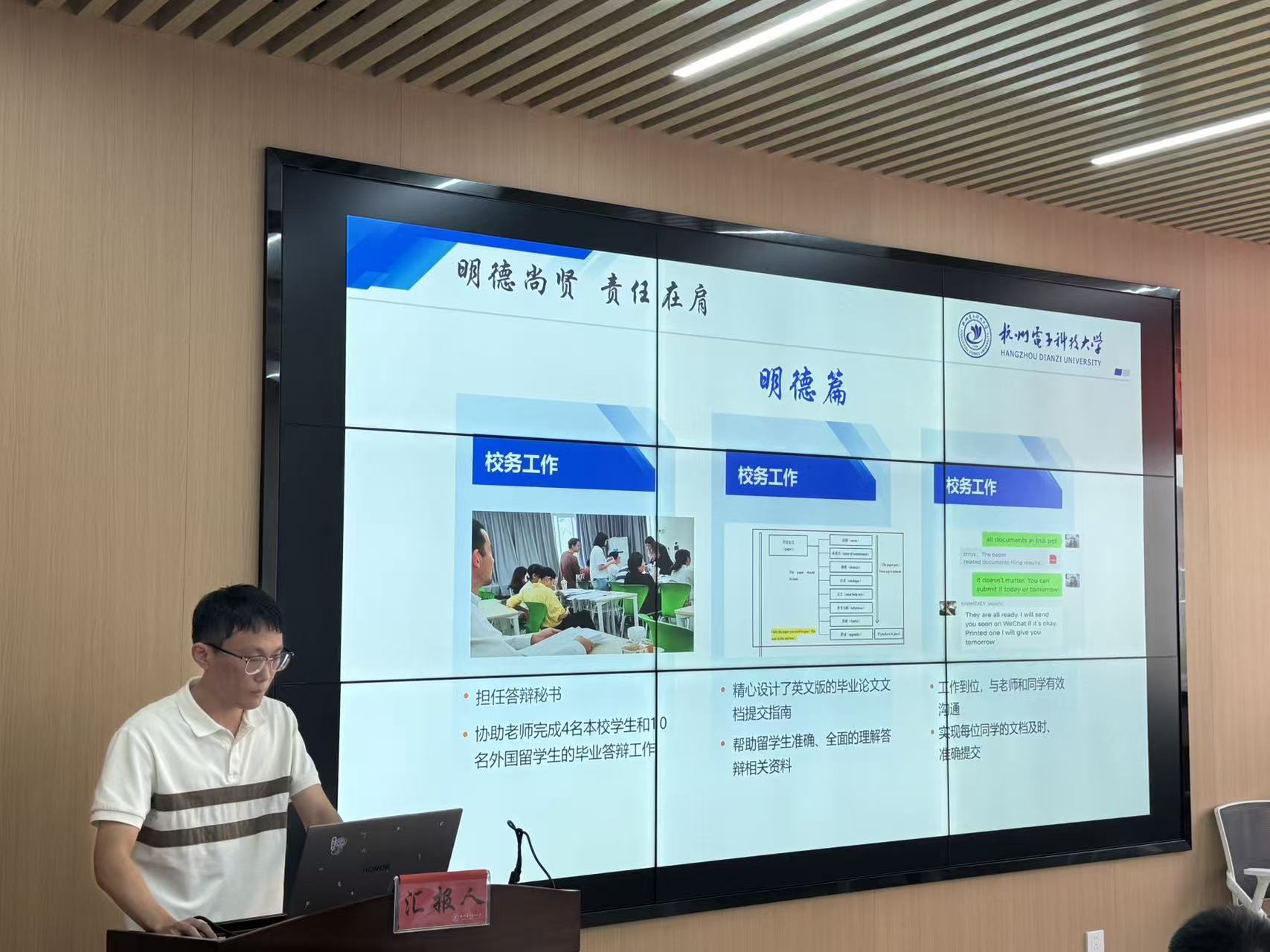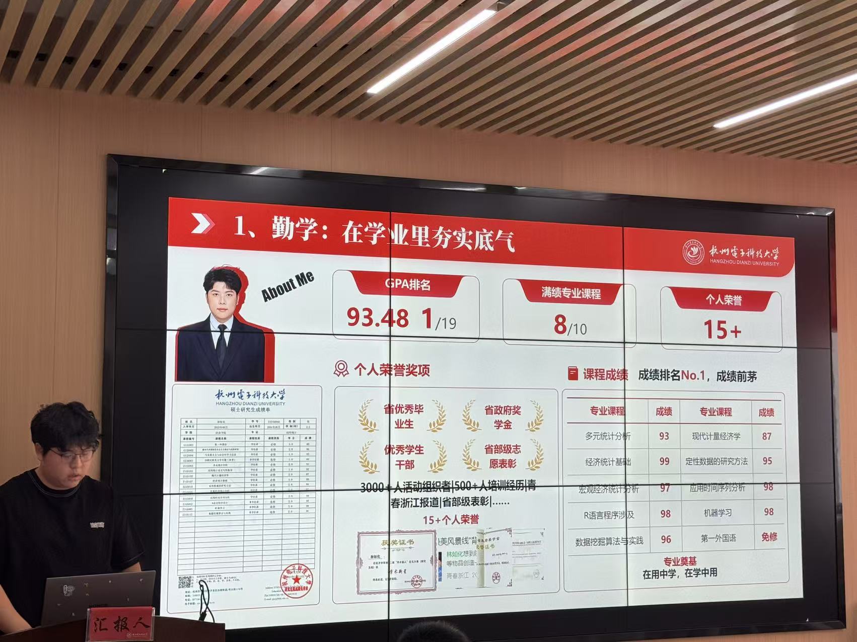 在评选个人展示环节,各候选人根据抽签顺序依次上台,分别从学习成绩、科研竞赛以及课余实践等各个方面介绍自己的优异成绩与成长经历。评委老师认真听取了每位候选人的汇报,并结合成绩排名、获奖情况、精神风貌以及答辩表现,对答辩进行了充分评议。展示完毕后,由教师代表与学生代表组成评委团就此次答辩情况进行现场无记名投票。