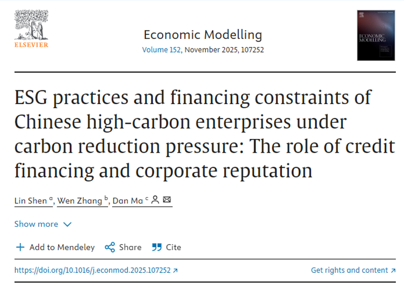 近日,我院申琳老师以第一作者身份完成的学术论文《ESG practices and financing constraints of Chinese high-carbon enterprises under carbon reduction pressure: The role of credit financing and corporate reputation》在SSCI期刊《Economic Modelling》发表。该期刊目前SSCI 分区为Q1,JCR分区为Q1,影响因子为4.2。此外,根据最新权威学术期刊影响力排名,《Economic Modelling》获得经济学类期刊全球排名第11位。