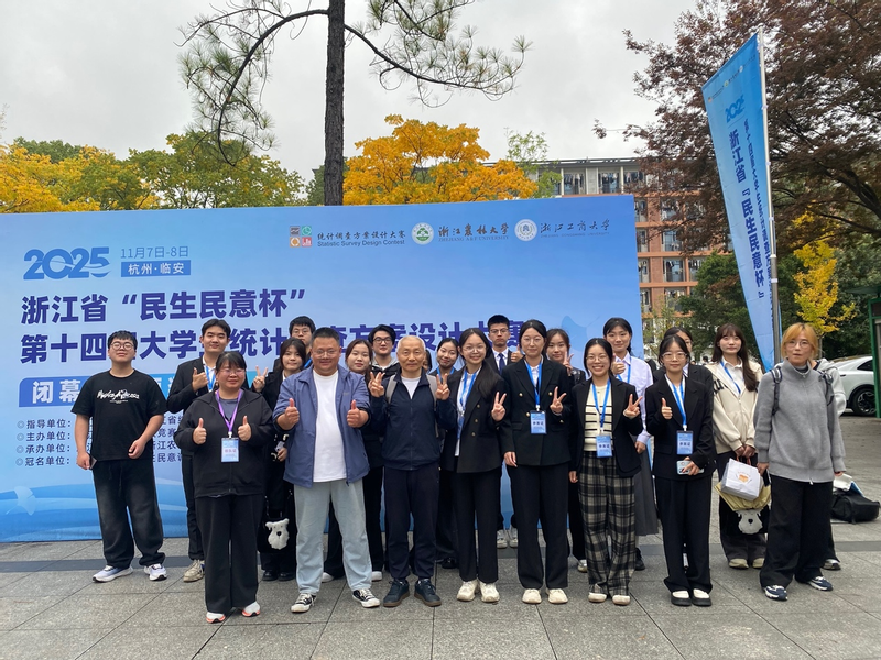 2025年11月8日,浙江省“民生民意杯”第14届大学生统计调查方案设计大赛决赛在浙江农林大学圆满落幕。共有来自包括杭州电子科技大学、浙江工业大学、浙江工商大学、宁波大学、浙江财经大学等全省80所学校的659个有效作品报名参加。经过激烈角逐,我校共获得一等奖2项、二等奖6项、三等奖3项及优秀组织奖。指导老师斯介生博士连续五年带队获得一等奖,实现五连冠,成为顶级金牌教练。